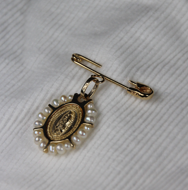 Medalla Oval Virgen de Guadalupe Troquelada con Perlas